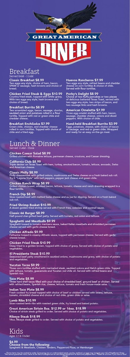 Welcome to the Great American Diner, a gem located at 167 Casa Blanca Rd, Casa Blanca, NM. This diner offers a delightful menu that highlights the flavors of classic American comfort food with a Southwest twist. From the popular Enchilada Plate, featuring savory enchiladas smothered in rich sauce, to the hearty Carne Asada Plate, there is something for everyone.